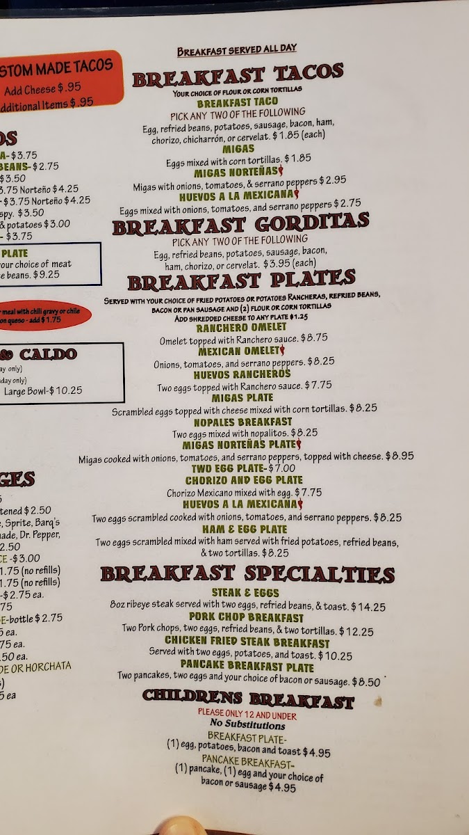 Breakfast items are also available, featuring dishes like breakfast tacos, migas tacos, and combinations with eggs, cheese, and meats. Lighter meal options include taco salads and bean fideo plates, which provide traditional flavors with a balanced composition.